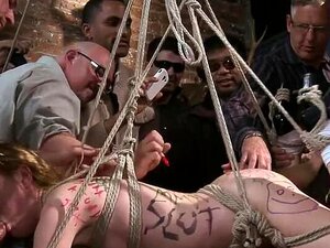 Blonde ffm dp banged in public. Blonde slave Emma Haize is hung in horizontal position and fucked with strap on cock on dominatrix Ariel X then double penetration fucked in public