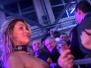 Babe throat banged in public bar. In public bar in Madrid hot brunette slave Carolina Abril dragged in crowded bar where made to suck huge dick and take cum in her mouth