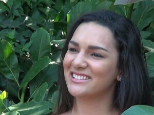 Brunette fitness babe Henessy flashes hot pair of tits in public for cash then fucks stranger with huge dick and sucks him off in quiet public place